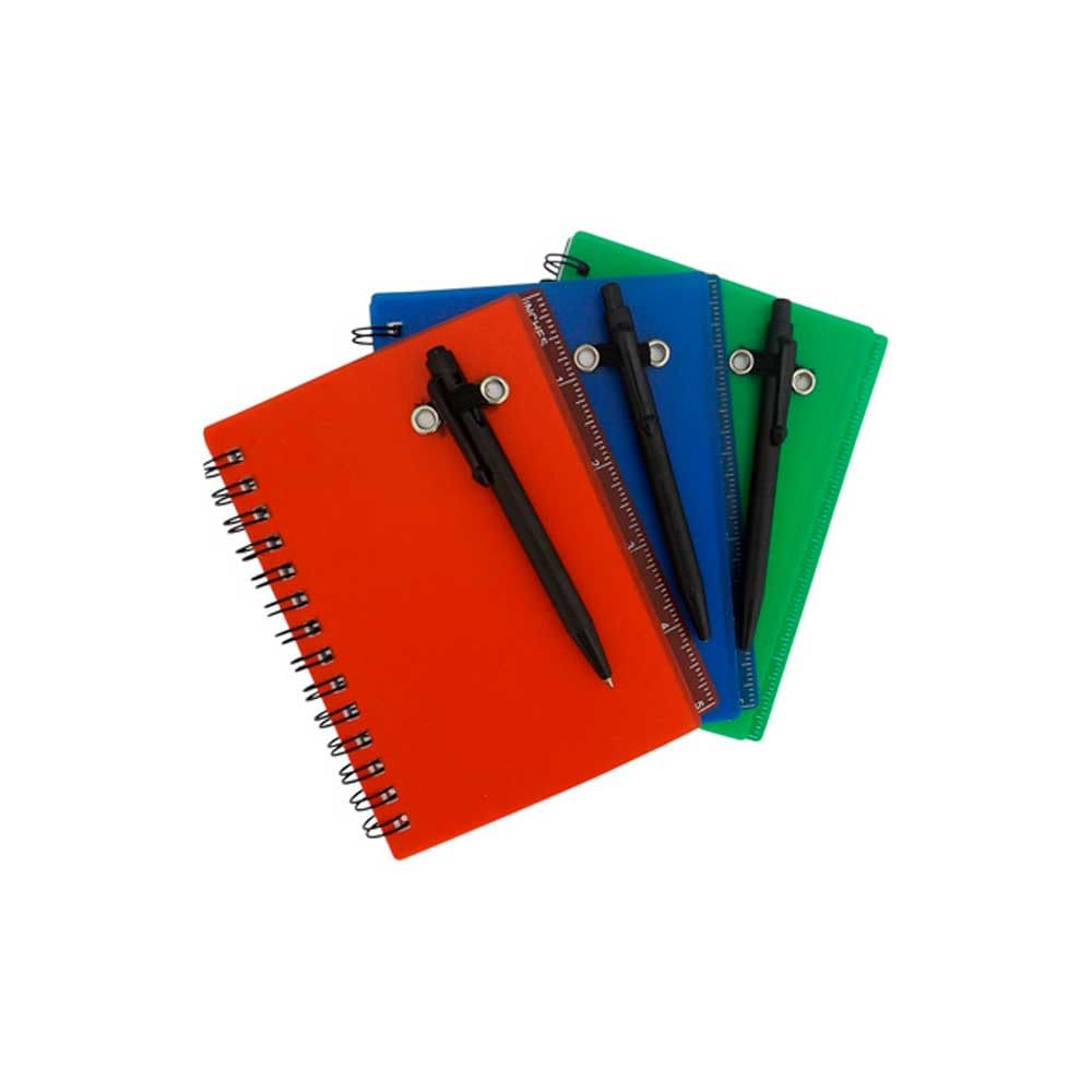 Bloco de anotações com capa plástica, com régua na contra capa. Acompanha mini caneta preta esferográfica.