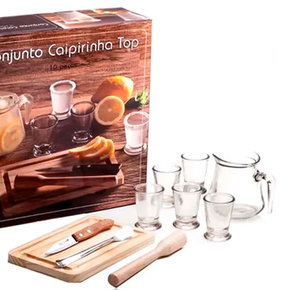 Quando a caipirinha é servida para várias pessoas, é comum usarmos uma jarra de vidro. Por isso, apresentamos esse kit com a jarra pequena, os copos de caipirinha e a tábua de bambu para cortar as frutas que farão parte da combinação.